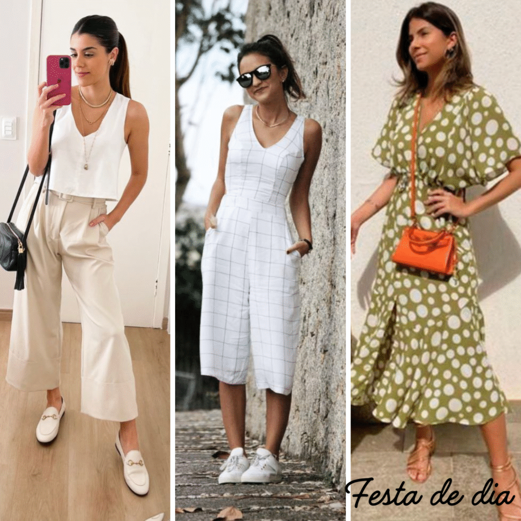 • Festas casuais durante o dia: tecidos leves e tons claros, vestidos fluidos, calças pantacourt, saias mídi e macacões confortáveis. Você pode combinar com sandálias, mocassins ou tênis que aliás são os queridinhos da vez