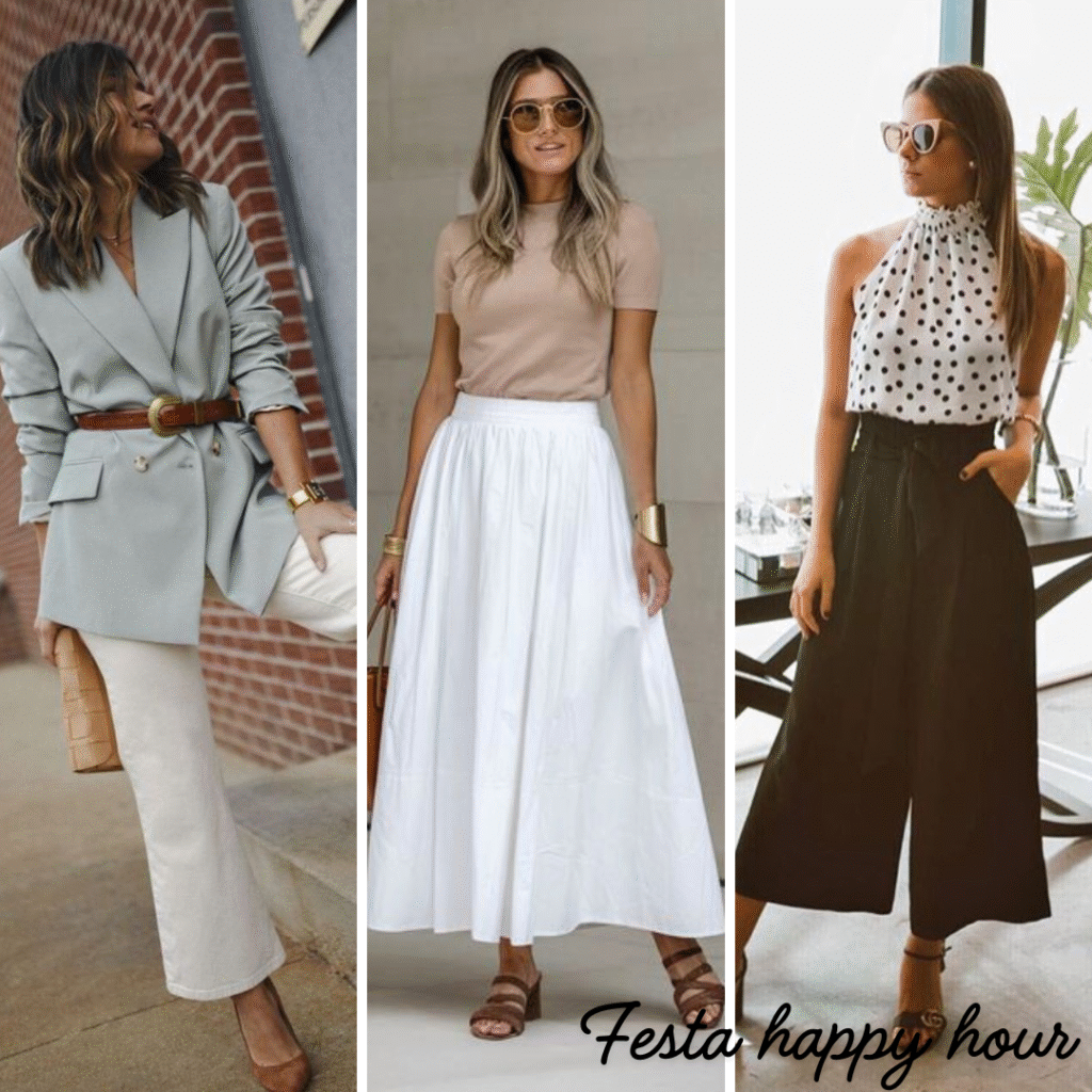 • Eventos à noite menos formais como por exemplo happy hours: blusas mais requintadas por exemplo de cetim, uma camisa mais chique, blazers leves, calças de alfaiataria ou jeans escuro. Nos pés, scarpins, sandálias de salto bloco e complementos como acessórios diferentes: brincos e bolsas menores