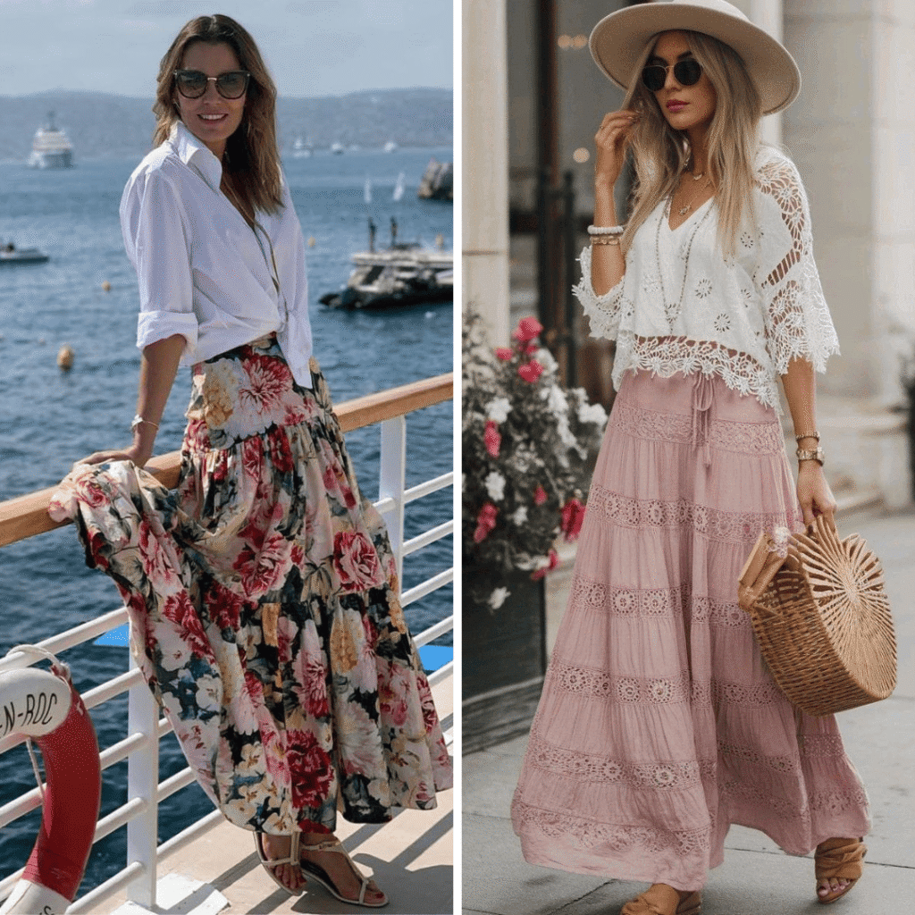 Além das cores e estampas acima não podemos nos esquecer dos florais e do boho que trazem leveza e beleza para as saias longas. Aliás, esse comprimento juntamente com o mídi são escolhas certeiras para você passar o verão lindíssima de saia.